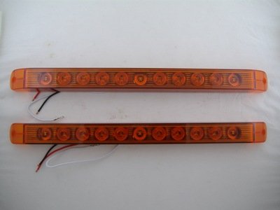 (2) BRIGHT 11 LED Slim Amber Running / Turn Signal / Flasher Lights with Amber Lens 17" Slimline style lights. 11 LED The lights come with 3 wire leads: White-Ground, Red - Flasher / Turn Lights and Black is Running Lights. These slim lights are made to be mounted by 1 screw at each end and a small hole drilled behind the middle for the wiring. The lights are running lights and then get brighter for the turn signal / flasher functions.(2-way Lights). These Lights are impact resistant and less susceptible to shock damage. Each LED is directly wired and water-tight sealed. These LEDs draw less current, generate less heat and are brighter and light faster than an incandescent bulb. 12 Volt Input. Read more...
